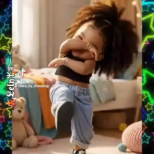 Menina com cabelo castanho e roupa azul fazendo careta com a mão na frente do rosto em um quarto com ursinho de pelúcia.