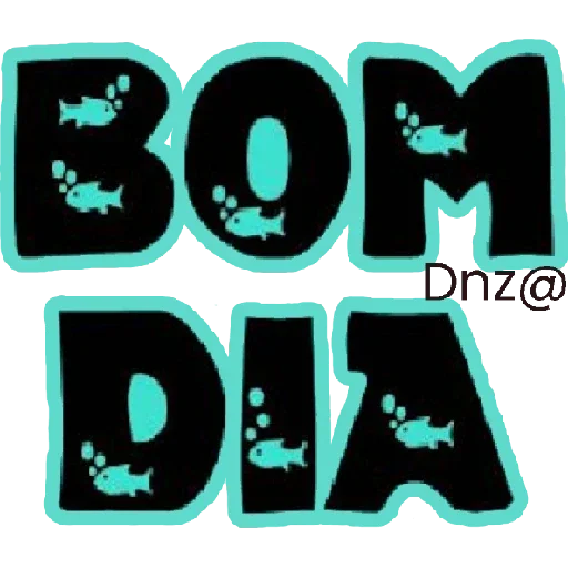 Um sticker com as letras 'BOM DIA' em preto com contorno verde-azul e peixinhos azuis dentro das letras.