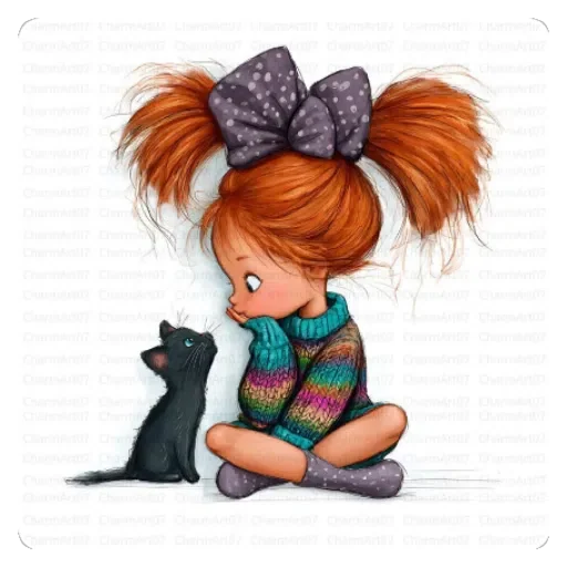 Menina ruiva com coque duplo e um laço roxo no cabelo sentada ao lado de um gato preto, ambos se olhando.