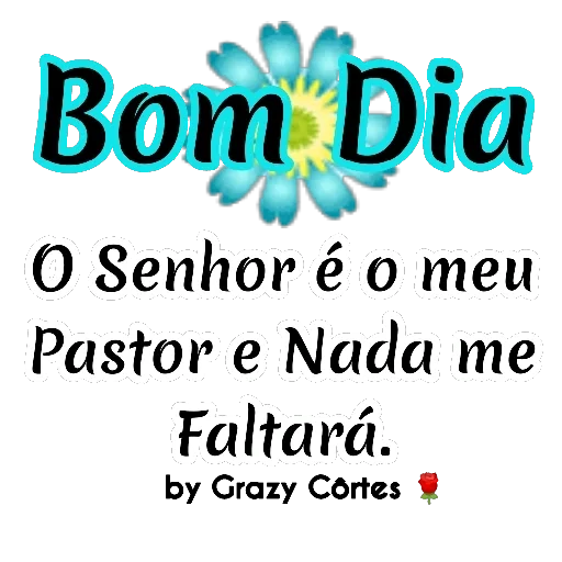 Uma flor de margarida azul com o texto 'Bom Dia' em letras grandes e a frase 'O Senhor é o meu Pastor e Nada me Faltará.' em letras menores abaixo, com o crédito 'by Grazy Côrtes' e um pequeno coração vermelho.