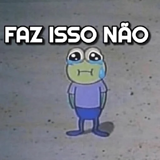 Um personagem de desenho animado de uma rã verde com expressão triste e lágrimas nos olhos, vestindo uma camisa roxa e shorts azuis, com o texto 'FAZ ISSO NÃO' acima.