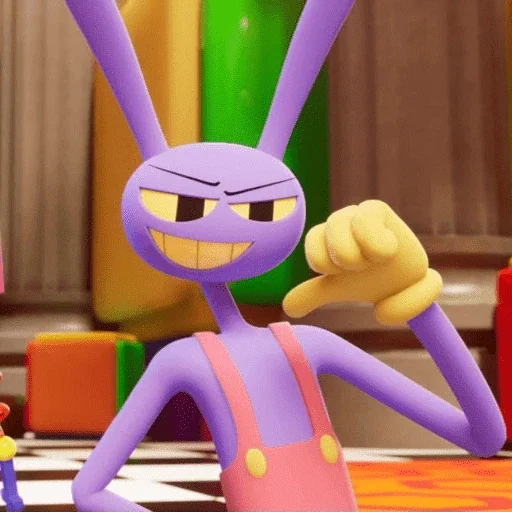 Um personagem de orelhas grandes e roxas com expressão facial zangada e dedo indicador levantado, vestindo macacão rosa.