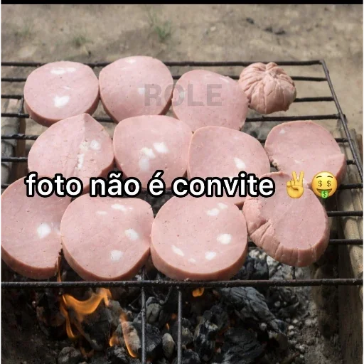Um grelhador com várias fatias de linguiça e um linguiça inteiro em cima, com chamas embaixo. A imagem tem o texto 'foto não é convite' sobreposto.