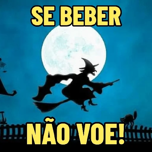 Uma bruxa preta voando em uma vassoura com a lua cheia ao fundo e um gato preto ao lado, com o texto "SE BEBER NÃO VOE!" em letras amarelas.
