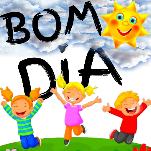 Três crianças saltando de alegria em um gramado verde com o texto 'BOM DIA' e um sol sorridente no céu.