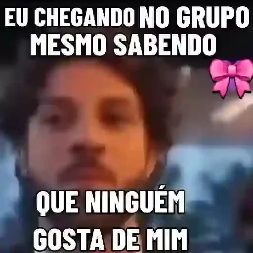 Rosto de uma pessoa com expressão séria e cabelos castanhos, com texto em branco sobreposto: 'EU CHEGANDO NO GRUPO MESMO SABENDO QUE NINGUÉM GOSTA DE MIM'. Há um laço rosa no canto superior direito.