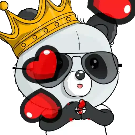 Um panda cartoon usando óculos de sol e uma coroa de rei, com corações vermelhos nos olhos e na mão.