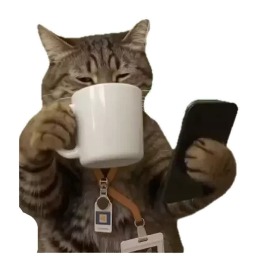 Gato com expressão séria, segurando uma xícara de café branco e um celular preto, com um crachá pendurado no pescoço.