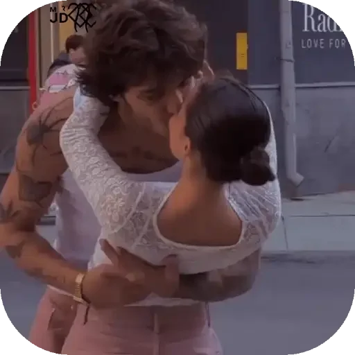 Um casal se beijando na rua, o homem tem tatuagens nos braços e a mulher está vestida de branco.