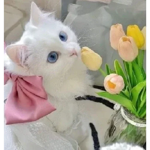 Gato branco com olhos azuis e laço rosa, cheirando tulipas amarelas e rosa.