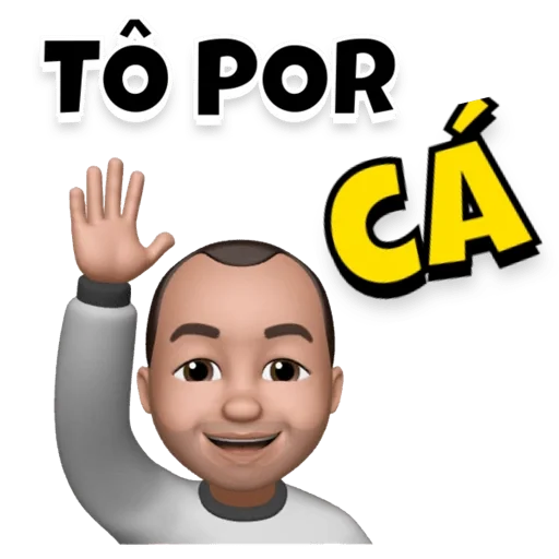 Um menino com a mão levantada e um sorriso, com o texto 'TÔ POR CÁ' acima dele.