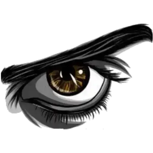 Olho castanho com sobrancelha e cílios postiços, expressão de surpresa ou preocupação.