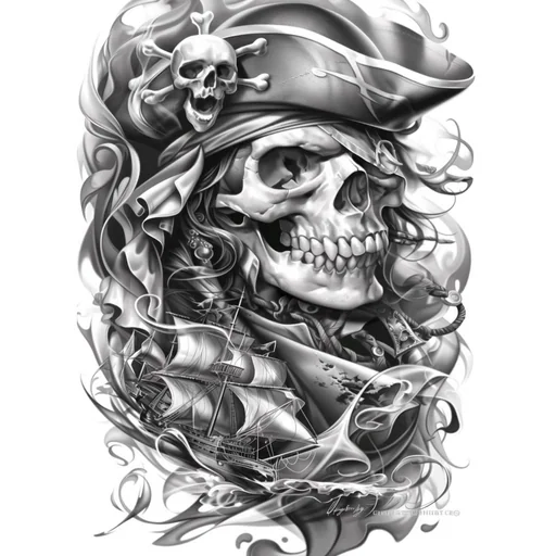 Crânio de pirata com chapéu e faixa, cercado por chamas e desenhos intricados em preto e branco.