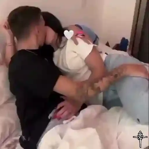 Um casal se beijando na cama, o homem de camisa preta e a mulher de camisa branca com um coração branco sobre a cabeça.