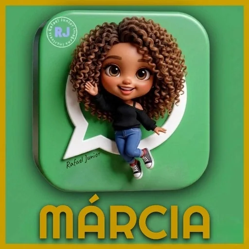 Uma menina cartoon com cabelo castanho encaracolado e roupa preta e azul senta-se numa bolha de fala verde com o nome 'MÁRCIA' em baixo.
