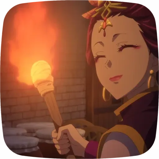 Uma mulher de anime com expressão séria, segurando uma tocha acesa em uma mão, com um enfeite na cabeça e uma pulseira roxa no pulso.