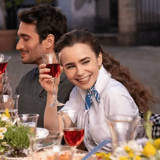 Um casal sentado à mesa, com a mulher sorrindo e segurando uma taça de vinho tinto, enquanto o homem ao lado olha para ela.