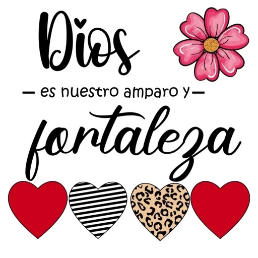 Uma figurinha com a frase 'Dios es nuestro amparo y fortaleza' em letras cursivas pretas, acompanhada de uma flor rosa e quatro corações coloridos.