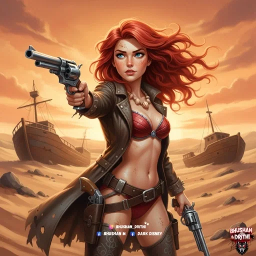 Uma mulher de cabelos vermelhos, vestida com biquíni vermelho e jaqueta marrom, segura duas pistolas em um cenário desértico com navios naufragados ao fundo, sob um céu laranja.