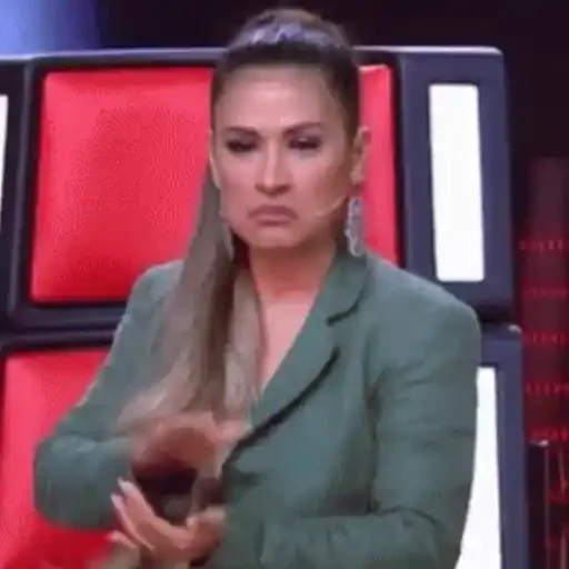 Mulher com cabelo castanho e blazer verde, sentada em uma cadeira vermelha, com expressão séria e mãos próximas ao corpo.