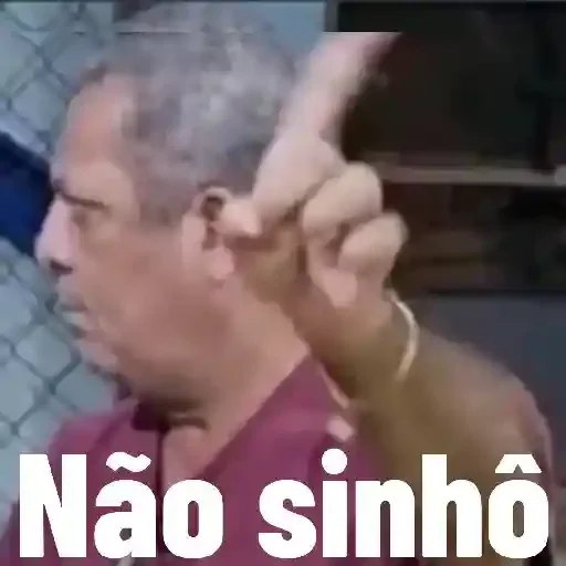 Um homem mais velho com cabelo grisalho e uma camisa rosa aponta o dedo indicador para cima com uma expressão facial séria. A imagem tem o texto 'Não sinhô' em letras brancas na parte inferior.