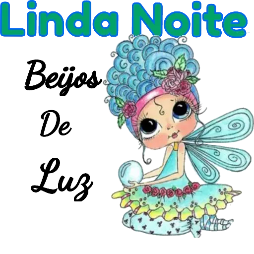 Uma fada com cabelo azul e vestido verde, com a frase 'Linda Noite Beijos De Luz' escrita em letras coloridas.