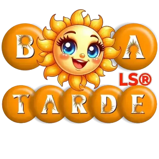 Um sol animado com olhos azuis e cílios, bochechas rosadas e sorriso, rodeado por bolas laranjas com as letras 'B', 'A', 'T', 'A', 'R', 'D', 'E', formando a frase 'BOA TARDE'.