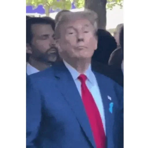 Um homem de meia-idade com cabelo loiro e terno azul, gravata vermelha e um lenço azul no bolso. Ele parece estar ao ar livre com outras pessoas ao fundo.