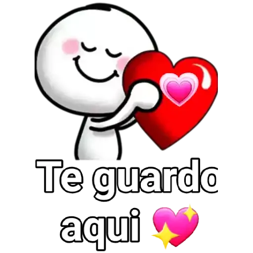 Um personagem de desenho animado com um sorriso e bochechas rosadas abraçando um coração vermelho com um coração rosa no centro. Abaixo dele, está escrito 'Te guardo aqui' com dois corações.