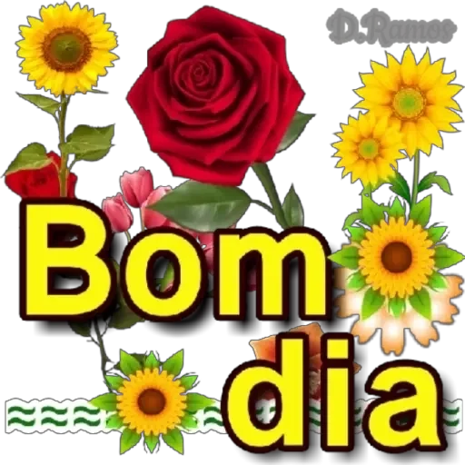 Uma composição de flores, incluindo um grande rosa vermelho e vários girassóis, com o texto 'Bom dia' em letras grandes e amarelas.