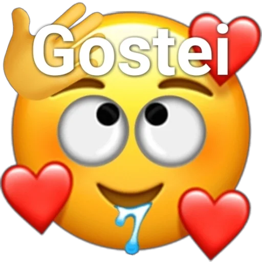 Emoji amarelo com olhos grandes e sorriso, mãos na cabeça, coração nos cantos e texto 'Gostei' em cima. Há também um coração vermelho no canto superior direito.