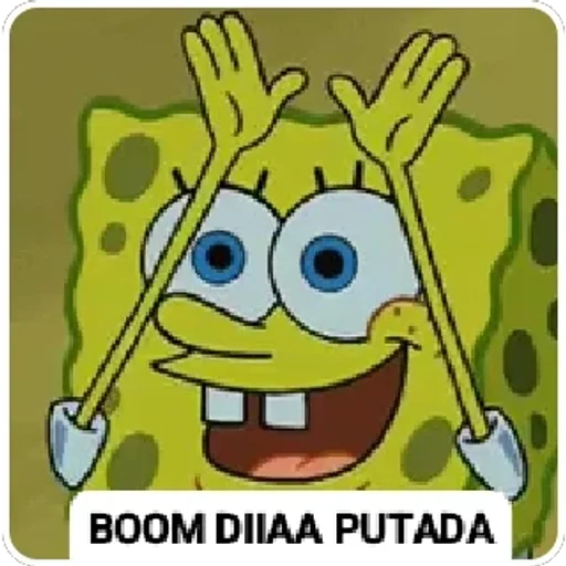 Bikini Bum, o Bob Esponja, com expressão de surpresa e alegria, mãos levantadas e texto 'BOOM DIIAA PUTADA' na parte inferior.