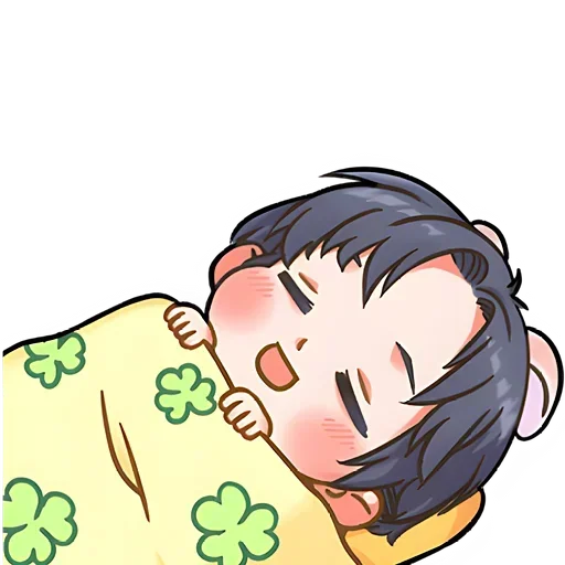 Menino de olhos fechados e sorriso, deitado em um cobertor amarelo com trevos verdes. Ele tem cabelo preto e bochechas rosadas.