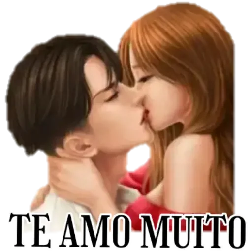 Um casal se beijando, com o homem de cabelo preto e a mulher de cabelo castanho. A frase 'TE AMO MUITO' está escrita abaixo deles.