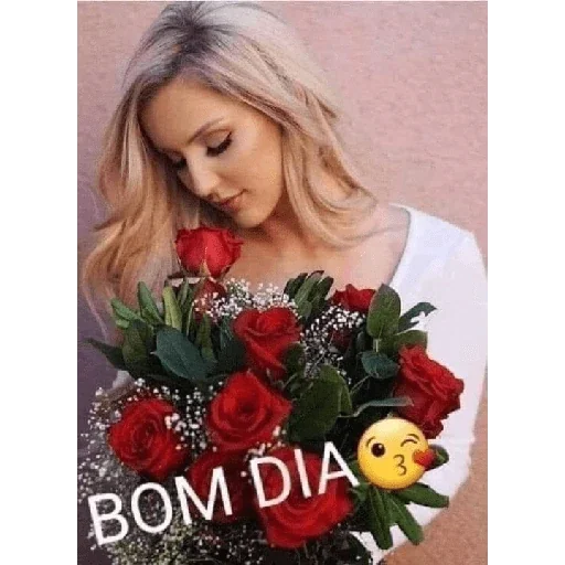 Uma mulher loira com um sorriso tímido olha para baixo enquanto segura um buquê de rosas vermelhas. Ela está vestida com uma blusa branca e o texto 'BOM DIA' está sobreposto na imagem.