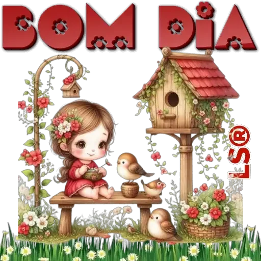Menina sentada em um banco com pássaros e um comedouro, cercada por flores, com a frase 'Bom Dia' em letras grandes vermelhas.