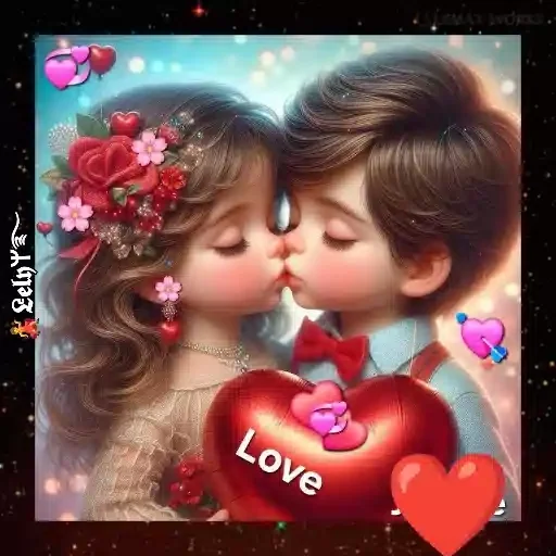 Um casal de crianças se beijando, com um coração vermelho gigante que diz 'Love' e vários corações decorativos ao redor. A menina tem uma flor na cabeça.