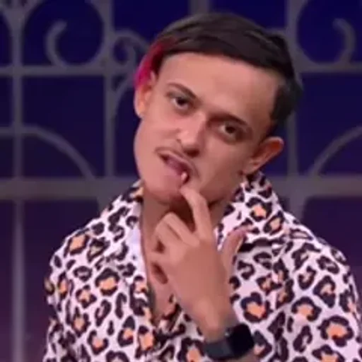 Homem com camisa de leopardos, fazendo careta e tocando o queixo, com fundo roxo e grades.