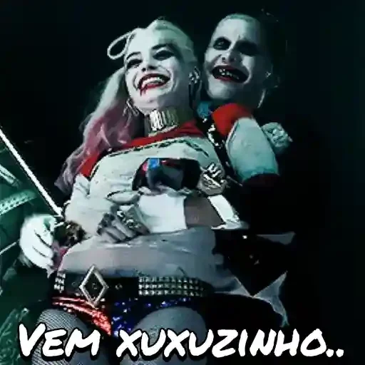 Harley Quinn e o Coringa sorrindo, com Harley vestida de uniforme de enfermeira, segurando um objeto, contra um fundo escuro. Abaixo deles, a frase 'VEM XUXUZINHO..'