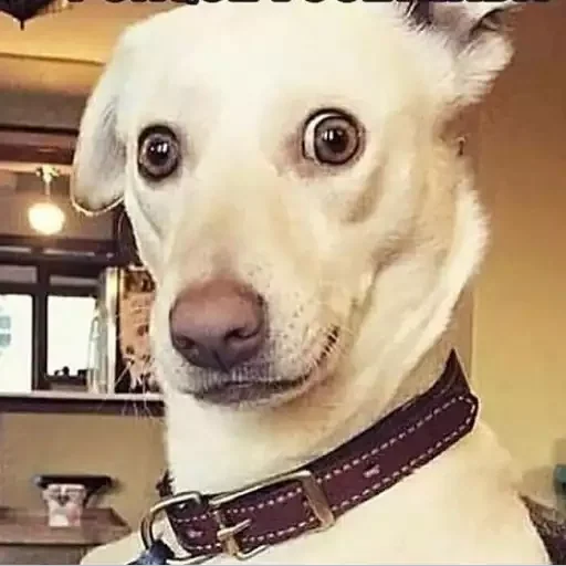 Cachorro branco com colar marrom, olhos arregalados e expressão surpresa.