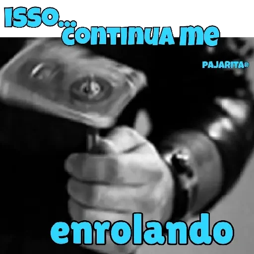 Mão segurando um controle remoto com texto 'ISSO... CONTINUA ME ENROLANDO' em letras azuis. A imagem é preto e branco com um fundo cinza.