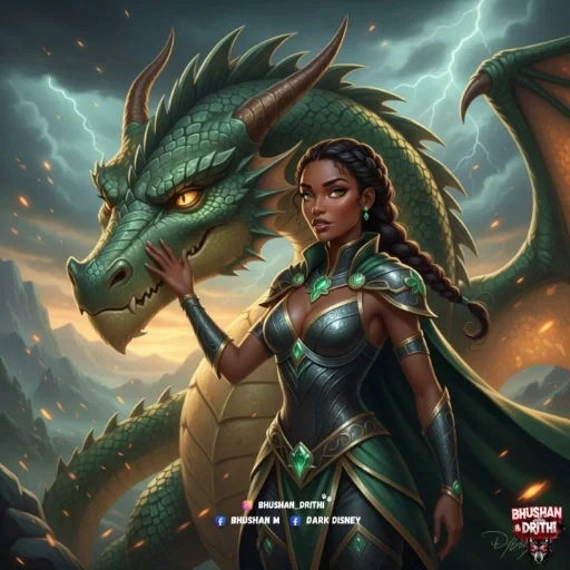 Uma mulher com armadura metálica verde e roxa ao lado de um dragão verde com olhos laranjas, em um cenário de tempestade com raios.