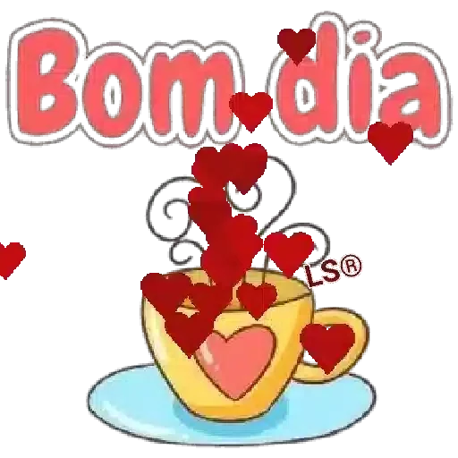 Um bule de chá amarelo com um coração rosa, cheio de corações vermelhos, com a frase 'Bom dia' em letras grandes rosa.