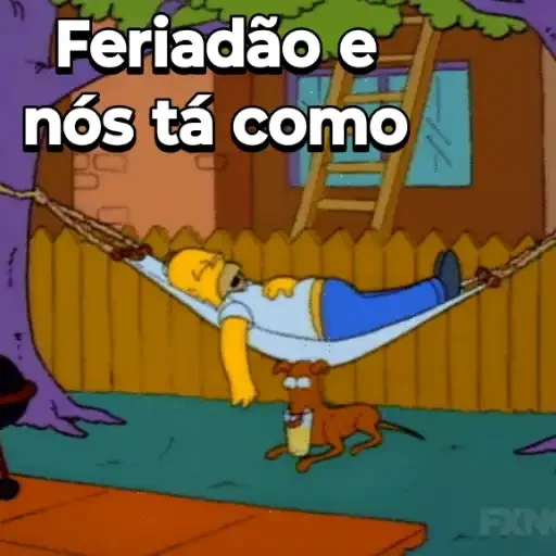 Homem deitado em uma rede, com um cachorro ao lado, em frente a uma casa. O texto 'Feriadão e nós tá como' aparece acima.