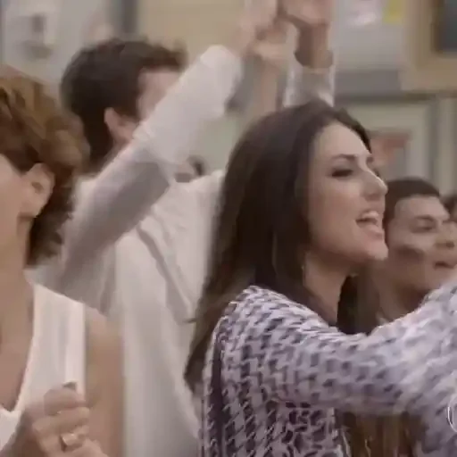 Grupo de pessoas comemorando, com uma mulher ao centro com os braços levantados e um sorriso no rosto.