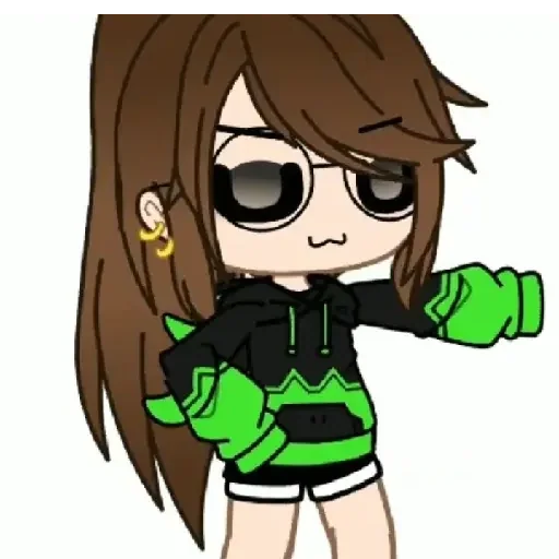 Uma garota de anime com cabelo castanho e óculos de sol, vestindo uma jaqueta preta e verde, luvas verdes e shorts.