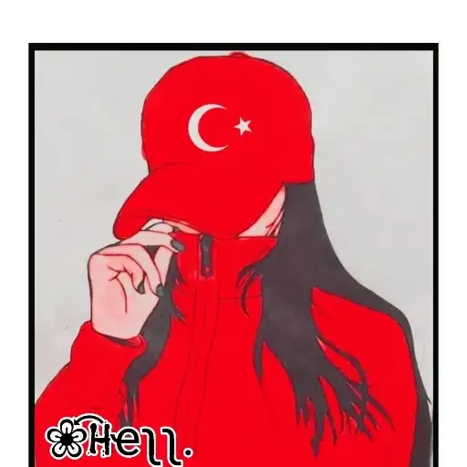 Uma mulher com uma camisa vermelha e um boné vermelho com a bandeira da Turquia. Ela está tocando seu rosto e há um texto '#Hell.' no canto inferior esquerdo.