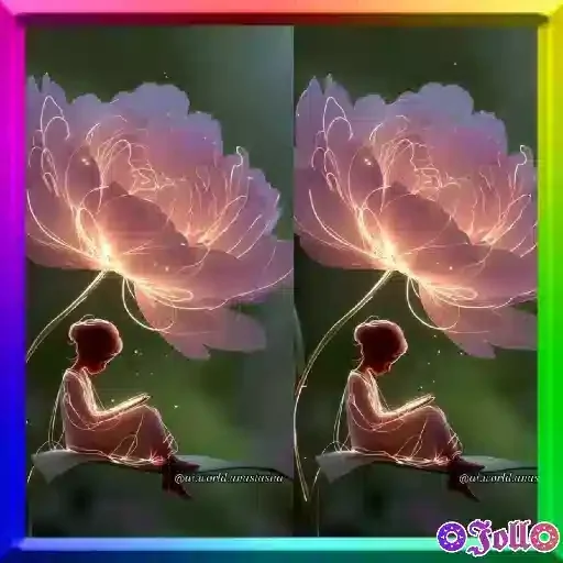 Uma menina sentada diante de uma flor rosa gigante, com um fundo escuro e um efeito de luz. A imagem é repetida lado a lado.
