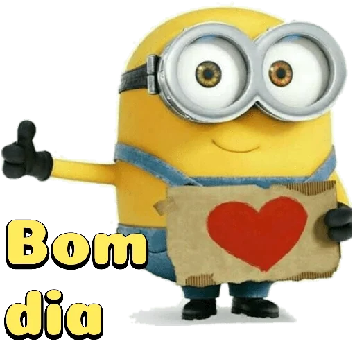 Um Minion amarelo com óculos grandes e um sorriso, segurando um cartão com um coração vermelho e fazendo um gesto com a mão. Abaixo dele, está escrito 'Bom dia'.