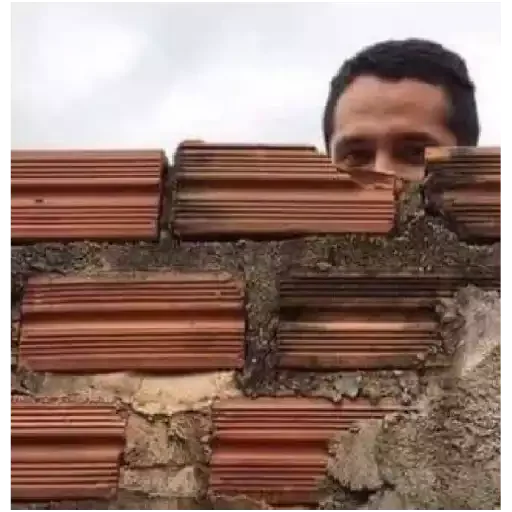Um homem com cabelos pretos e óculos aparece por trás de uma parede de tijolos vermelhos, olhando para frente com uma expressão séria.